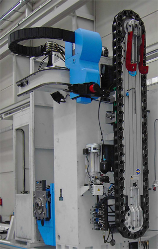 Automatická výměna nástrojů s řetězovým zásobníkem pro šedesát nástrojů. Pohon zásobníku je řízen hydromotorem, ovládání ramene podavače je hydraulicky.- Upínací kužel nástroje ISO 50 DIN 69871/A